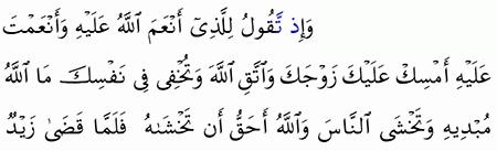 و إ ذ ت ق ول ل ل ذ ي أ ن ع م الل ه ع ل ي ه و أ ن ع م ت ع ل ي ه أ م س ك ع ل ي ك ز و ج ك و ات ق الل ه و ت خ ف ي ف ي ن ف س ك م ا الل ه م ب د يه و ت خ ش ى الن اس و الل ه أ ح ق أ ن ت خ ش اه ف ل م ا ق ض ى ز ي د م ن ه ا و ط ر ا