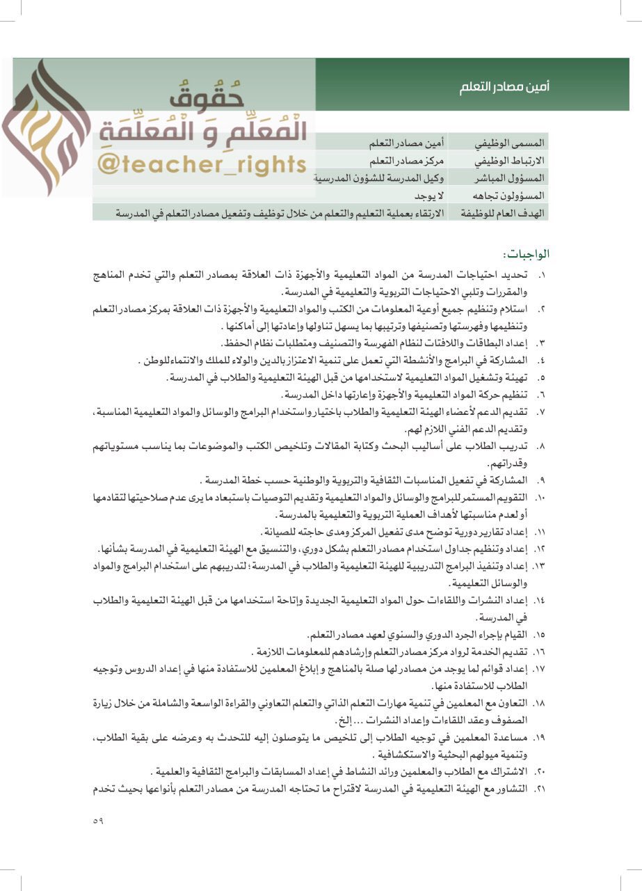 المهام المطلوب تنفيذها من أمين مركز مصادر التعلم الإدارية والفنية والتعليمية. مهام امين مصادر التعلم كما في الدليل التنظيمي لمدارس التعليم العام 1 تحديد احتياجات المدرسة من المواد التعليمية والأجهزة ذات. واجبات ومسؤوليات أمين مركز مصادر التعلم 1. إعداد تقرير سنوي عن المركز واحتياجاته وعرضه على لجنة مركز مصادر التعلم لمناقشته واعتماده قبل إرساله إلى إدارة التجهيزات المدرسية وتقنيات التعليم.