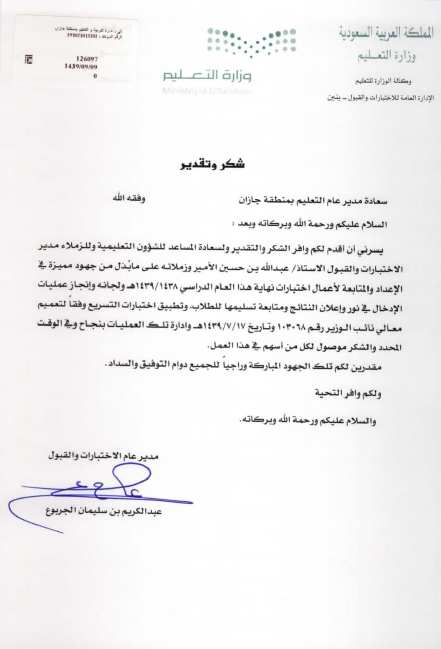 ট ইট র إدارة تعليم جازان تلقى مدير تعليم جازان خطاب شكر وتقدير من مدير عام الاختبارات والقبول بـ وزارة التعليم تضمن الإشادة بجهود المساعد للشؤون التعليمية ومدير إدارة الاختبارات والقبول في الإعداد والمتابعة لأعمال اختبارات