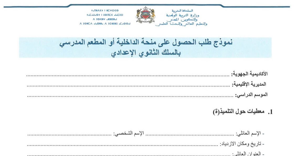 نموذج طلب الحصول على منحة الداخلية أو المطعم المدرسي بالسلك الثانوي الإعدادي